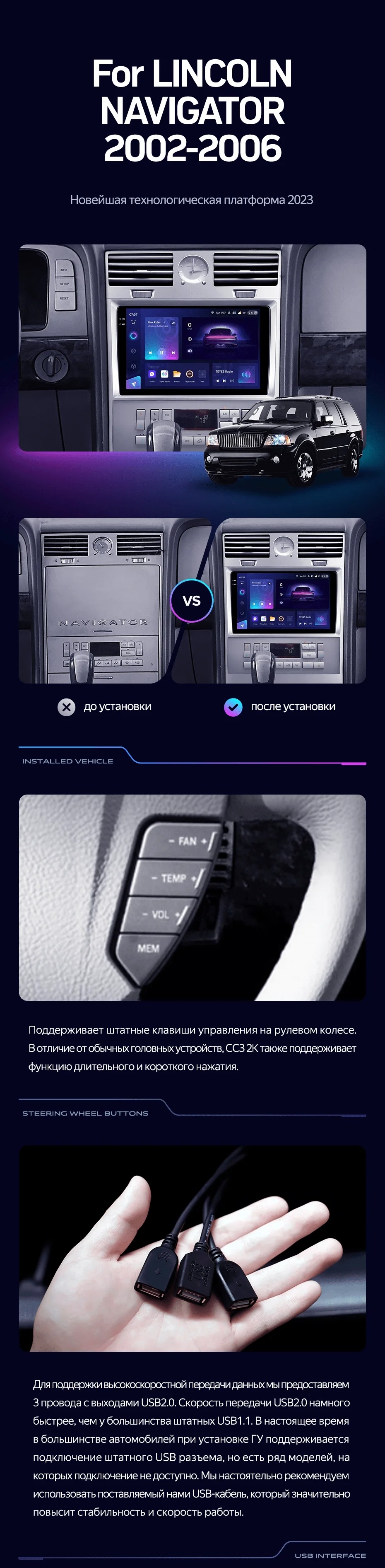 Полный комплект установки магнитолы Teyes с рамкой и проводкой можно выбрать в каталоге штатных магнитол Lincoln Navigator (2002-2006).