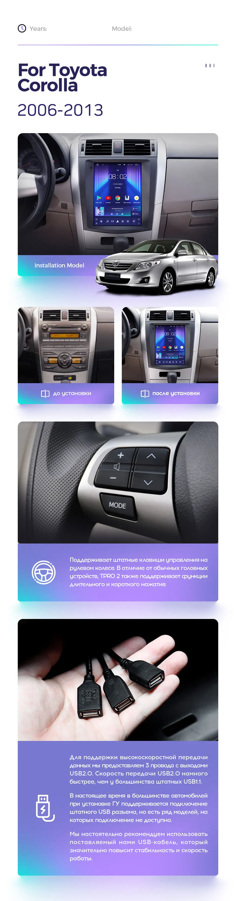 Полный комплект установки магнитолы Teyes с рамкой и проводкой можно выбрать в каталоге штатных магнитол Toyota Corolla 10 E140 E150 2006-2013.
